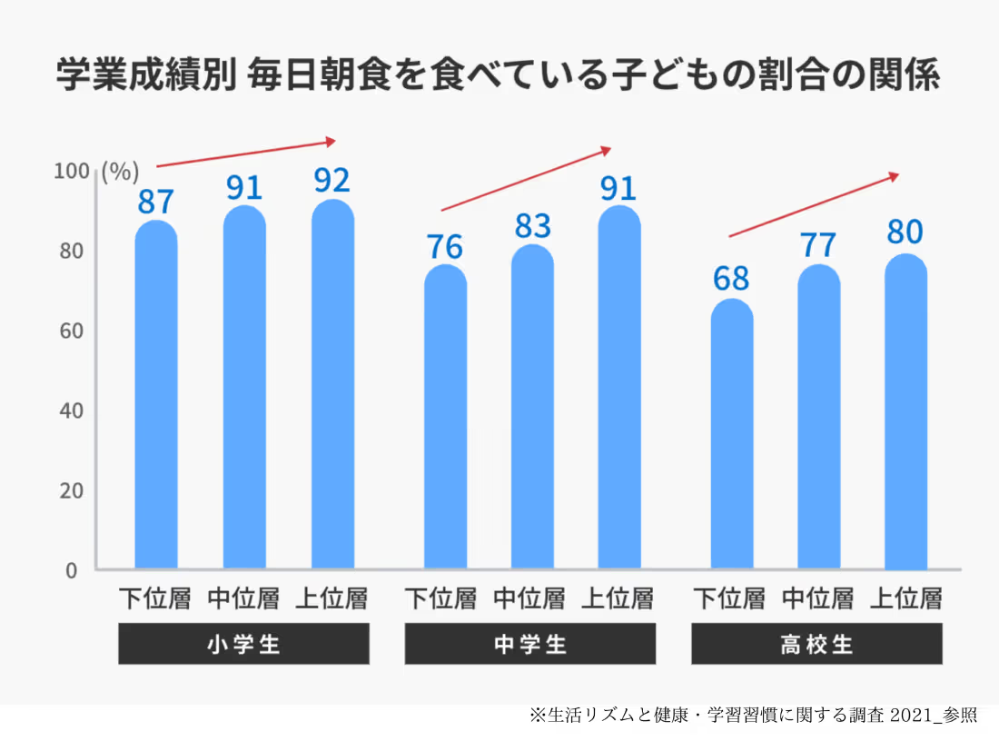 朝食を摂っている子の割合は、学業成績が上位になるほど多いです。